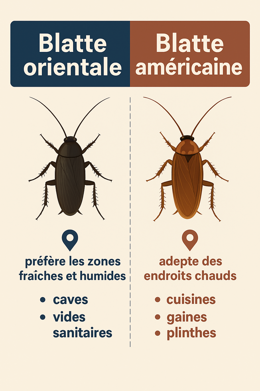📌 Blatte orientale : préfère les zones fraîches et humides (caves, vides sanitaires).