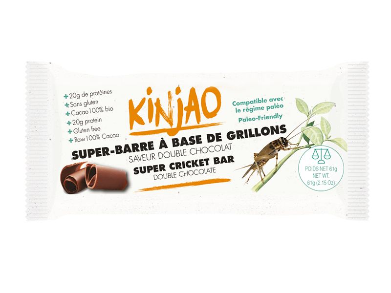 Commercialisée par l’entreprise ENTOTECH sous la marque KINJAO, la «super-barre» aux grillons saveur double-chocolat contient 20g de protéines par barre. Cette barre permettra aux sportifs de renforcer leurs apports en protéines naturelles ou de combler ceux qui cherchent une alternative plus écologique aux barres traditionnelles.
